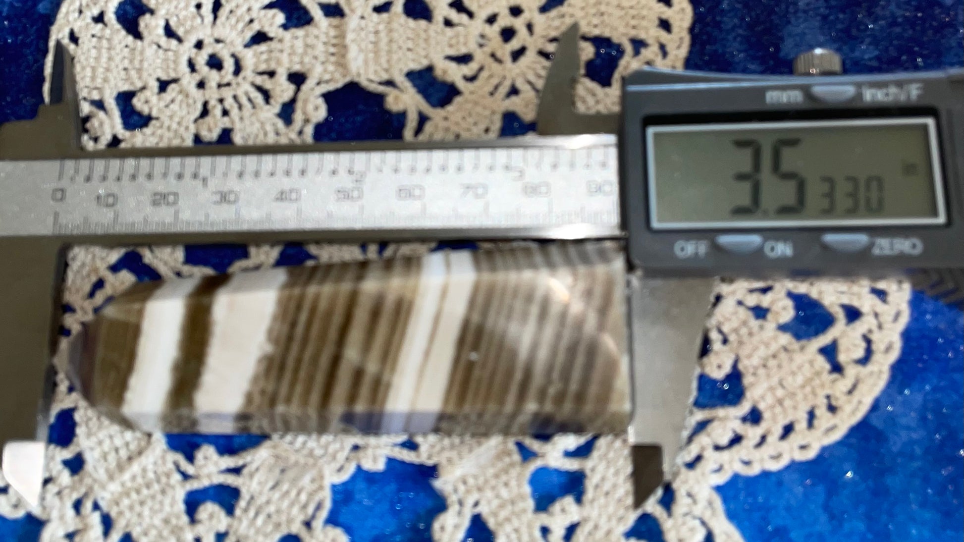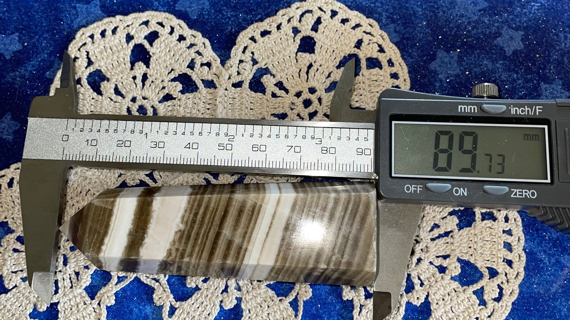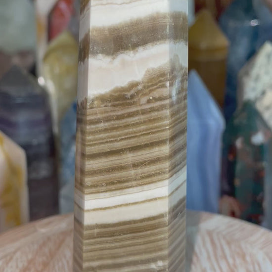 This is a Chocolate Calcite tower. The banding on this tower is phenomenal!! It is 89.73 mm or 3 1/2 inches tall. It weighs 111 grams.