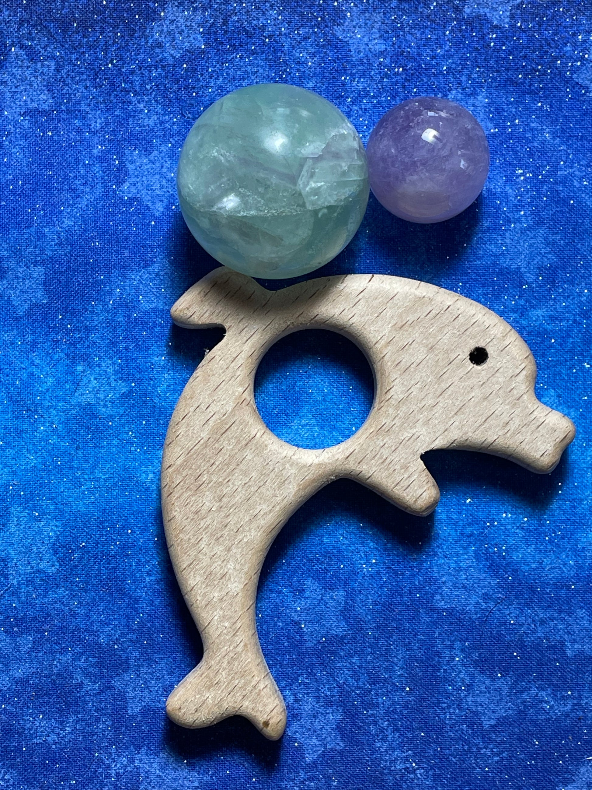 This is a fun little set to start a youngster into rock and crystal collecting. This set comes with a Wooden Dolphin stand, a 30mm Baja Green Fluorite Sphere, and a 20mm Amethyst Sphere. What a great way to start or add to a collection!!