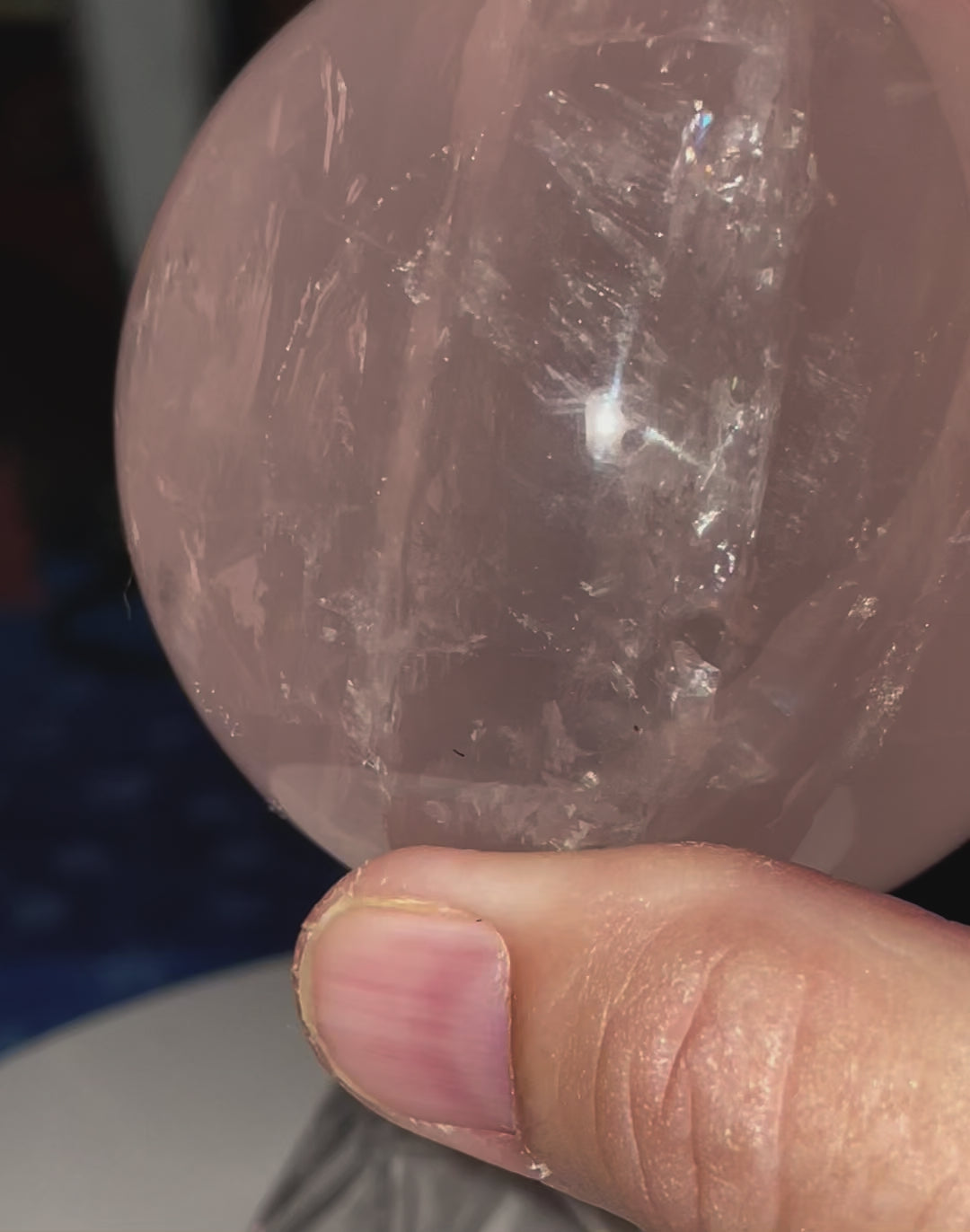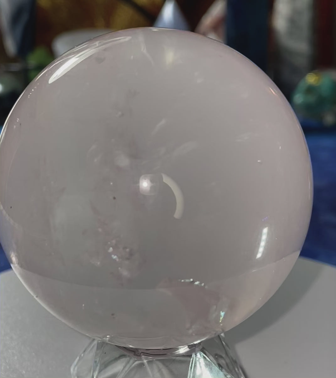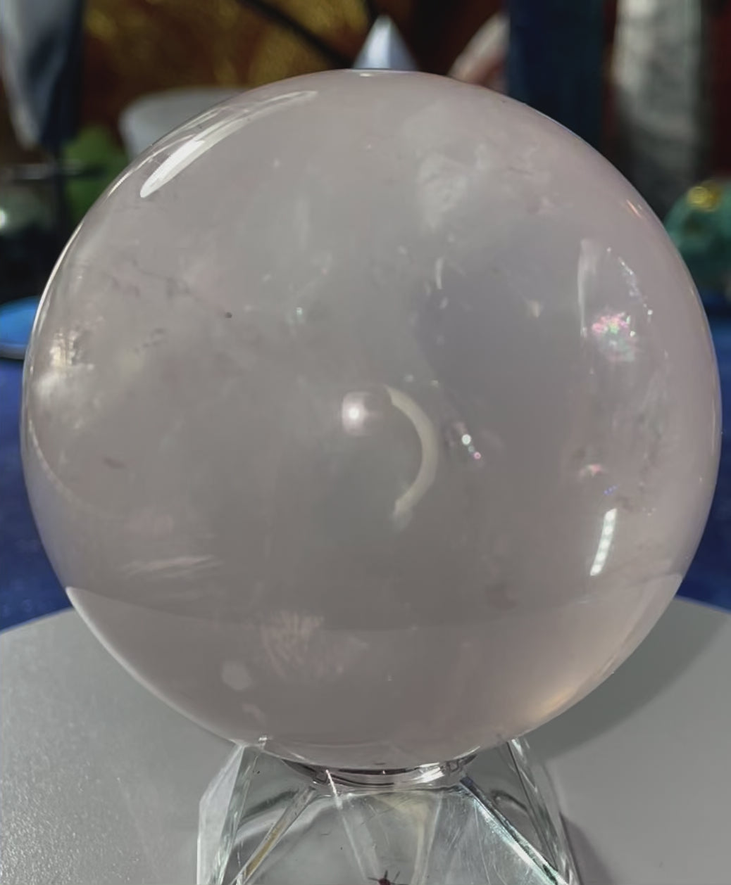 This Girasol White Rose Quartz is ethereal. The clear areas are translucent making it easy to see the rainbows inside. If that isn’t enough, the asterisms and stars are breathtaking!! This sphere is 61.1 mm across and weighs in at 1 pound 2 ounces. Girasol White Rose Quartz is a stone of gentle but powerful calming energy. It promotes mental clarity and enlightenment. It also encourages creativity, focus, and balance. It is a wonderful stone for opening one to receiving messages from Spirit.