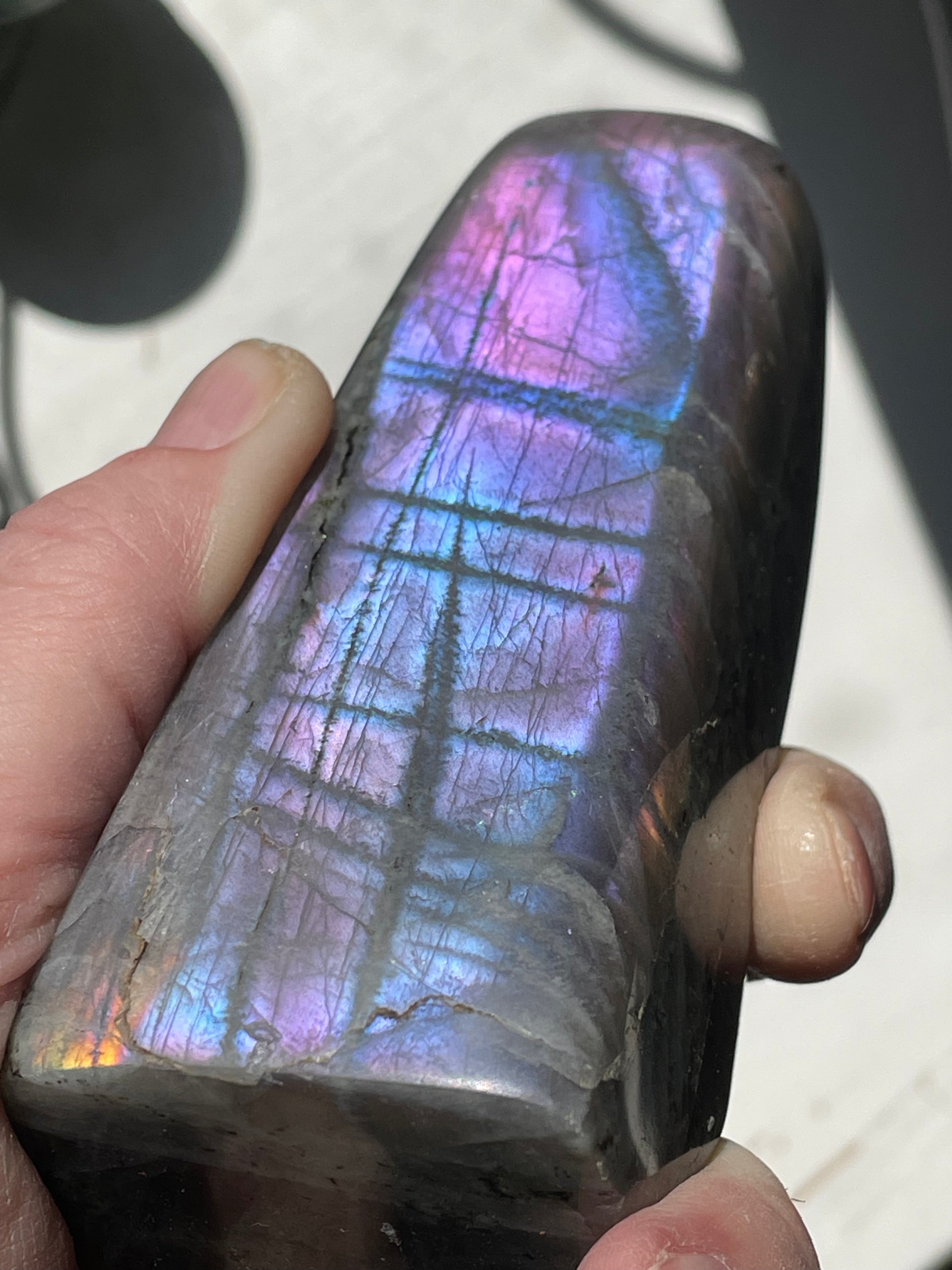 This labradorite free form features a beautiful lavender lilac colored flash. It is a chunky piece weighing in at 11 1/2 ounces. It measures 4 1/4 inches tall and is 1 1/2 inches wide on one side and 1 1/2 inches on the other. Let this lovely lab assist you in bringing light and raising you consciousness.
