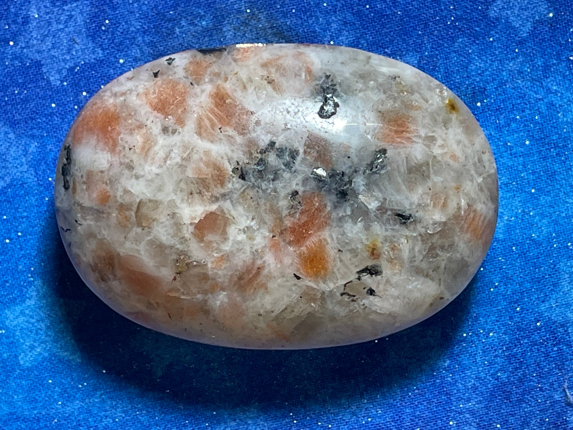 This beautiful Sunstone Palm has so much going on. It has flecks of Sunstone with the orange flash. It also has smokey quartz and rainbow flashes in it. There are quartz windows in it so that you can see inside. This little gem measures 2 1/3 inches by 1 3/5 inches. Sunstone is a leadership stone providing strength, abundance of blessings, and helps mature male energy.