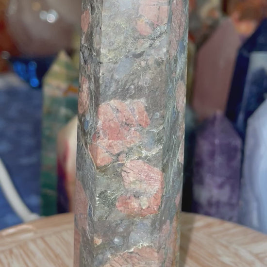 This is Que Sera (Blue Rhyolite). It has so much color and depth! It is 88.66 X 22.63 mm which is almost 3 1/2 inches tall. It weighs 91.27 grams.