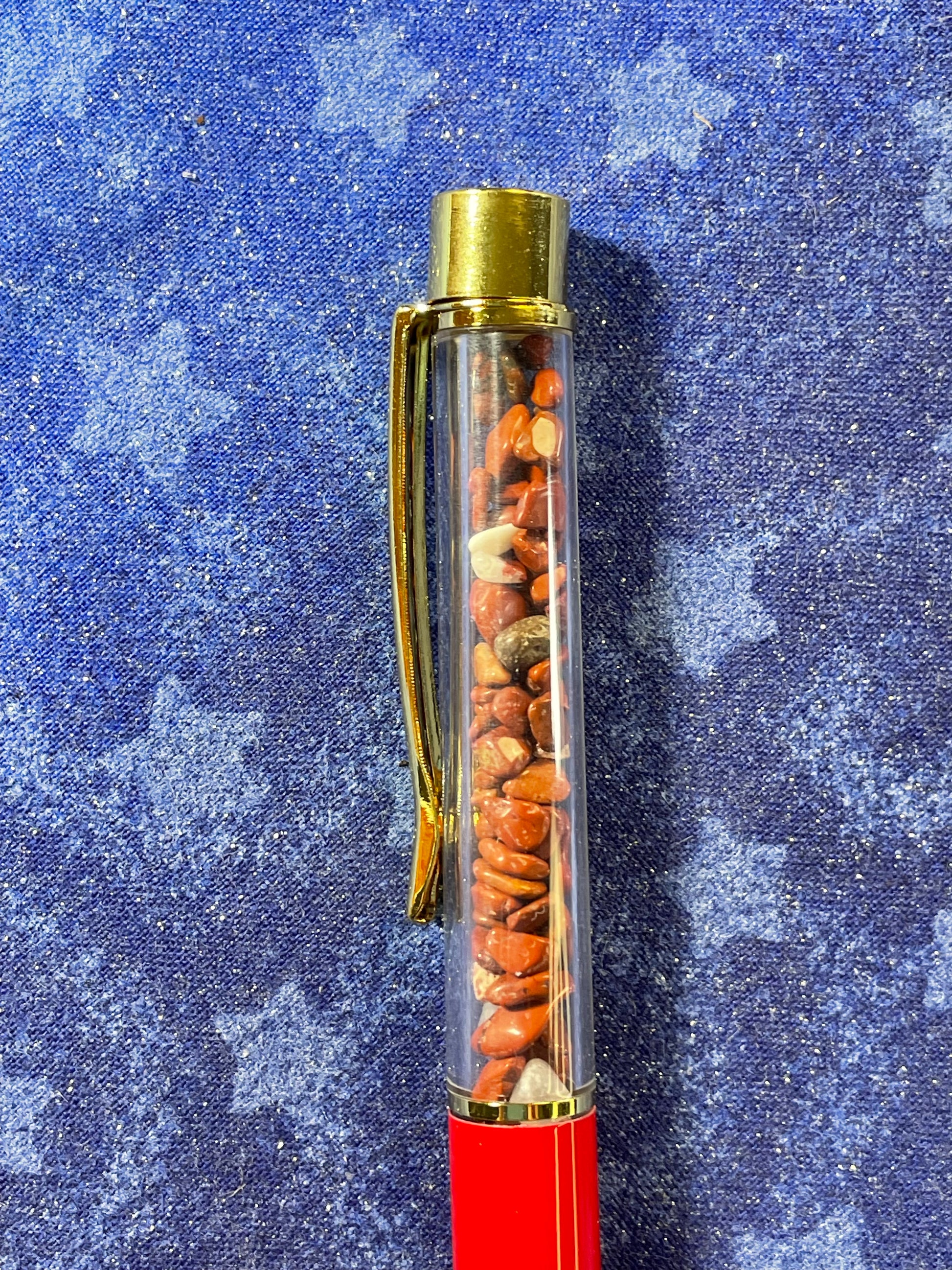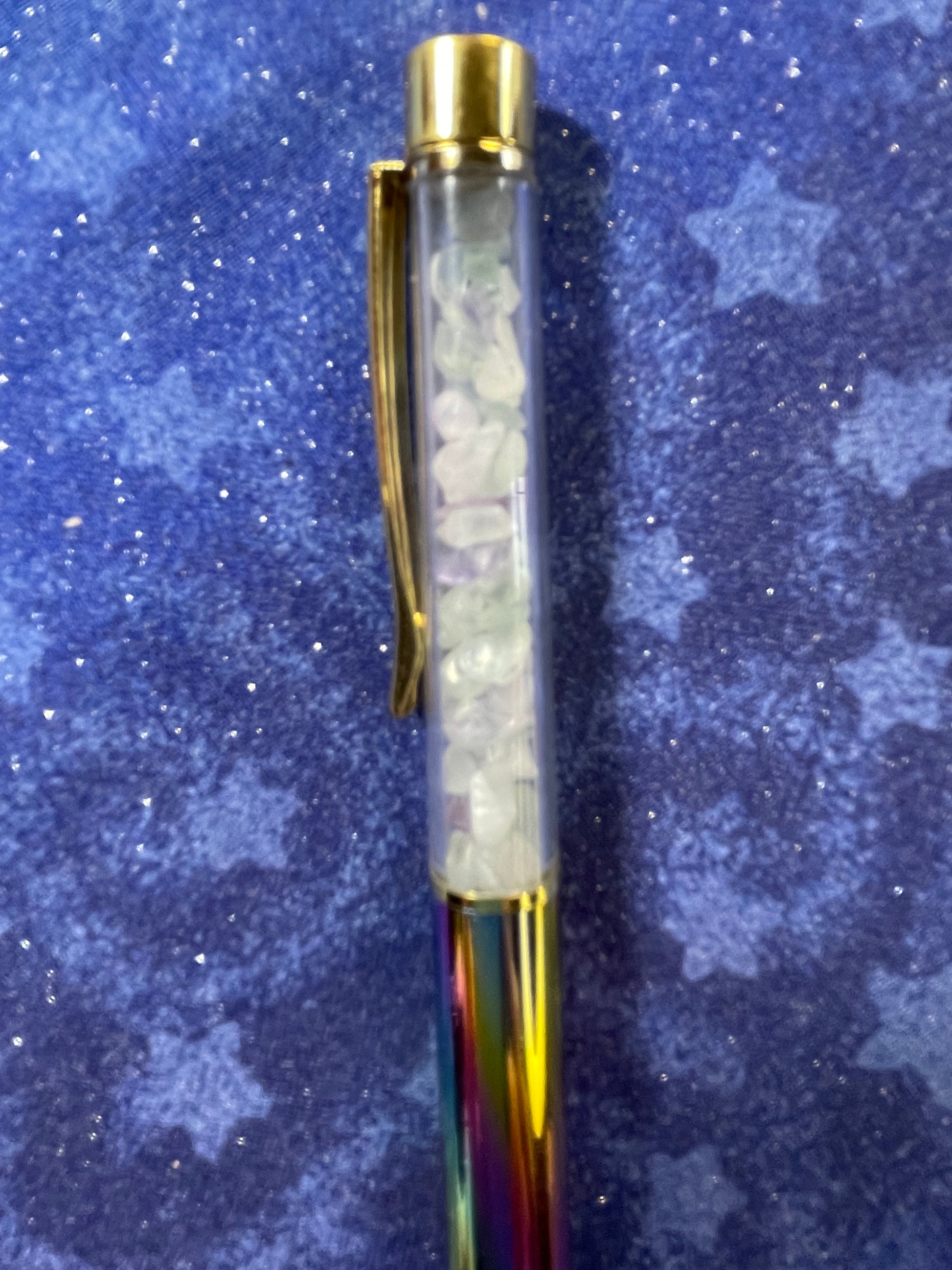 Black ink in a pen with crystal chips in the top barrel. Your choice of crystal type.
